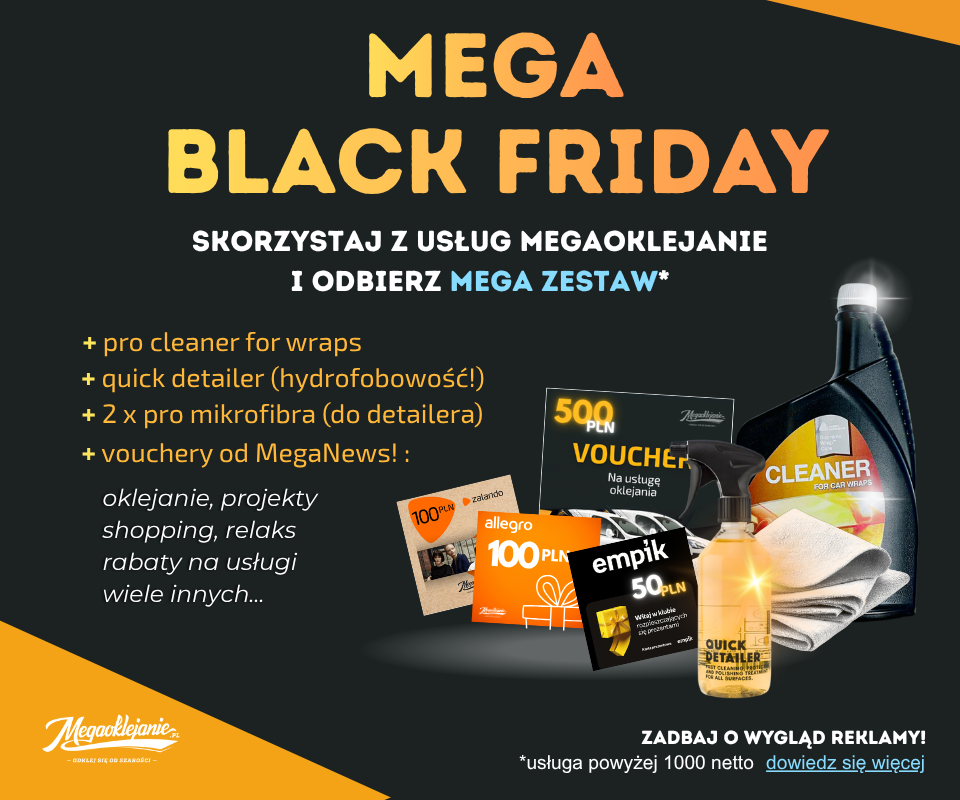 Podczas MEGA BLACK FRIDAY w Megaoklejanie zrealizuj swoją usługę i odbierz MEGA ZESTAW GRATIS – pełen produktów i voucherów, które pomogą Ci zadbać o wygląd Twojej reklamy i… portfela